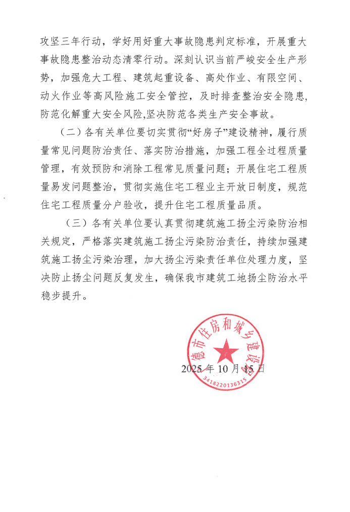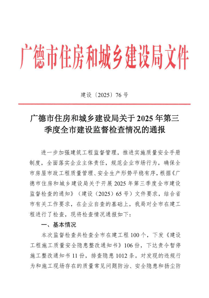广德市住房和城乡建设局关于2025 年第三季度全市建设监督检查情况的通报