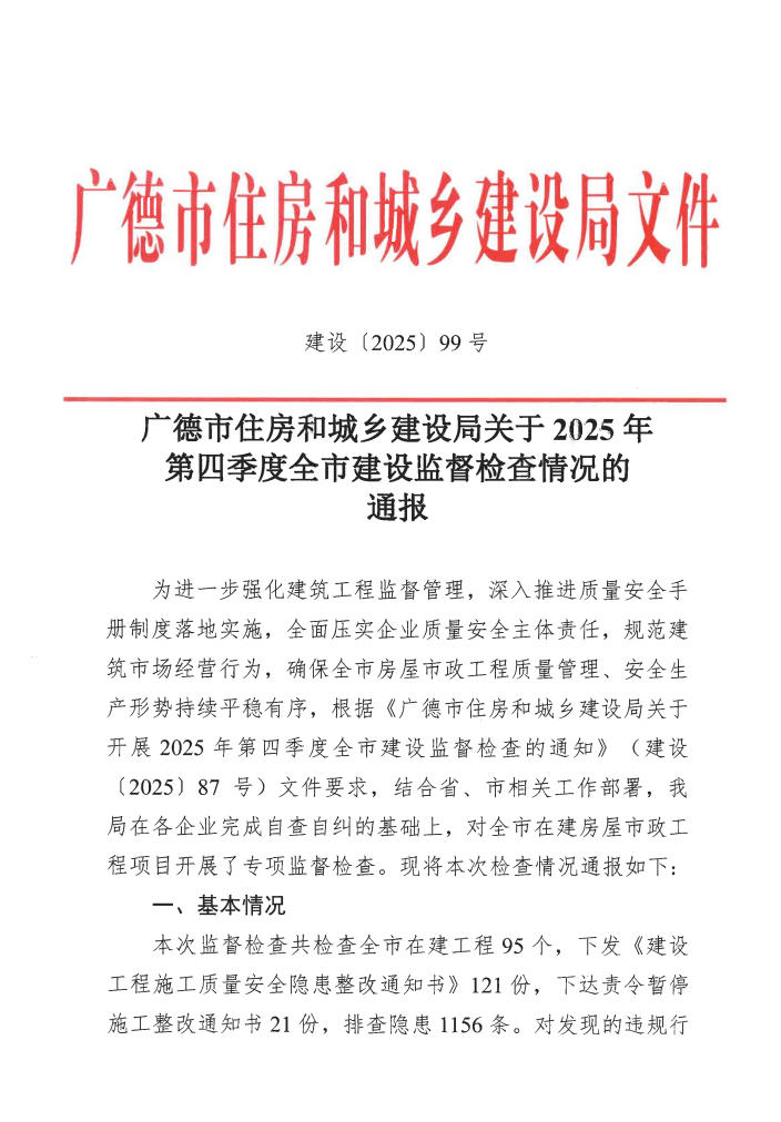 广德市住房和城乡建设局关于2025年第四季度全市建设监督检查情况的通报