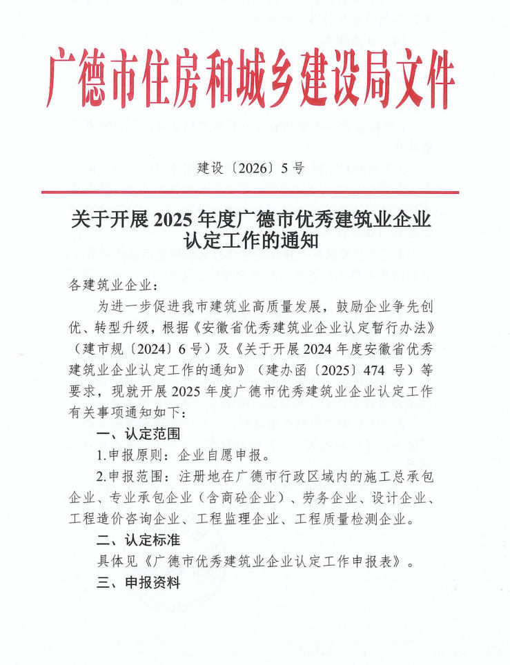 关于开展2025年度广德市优秀建筑业企业认定工作的通知