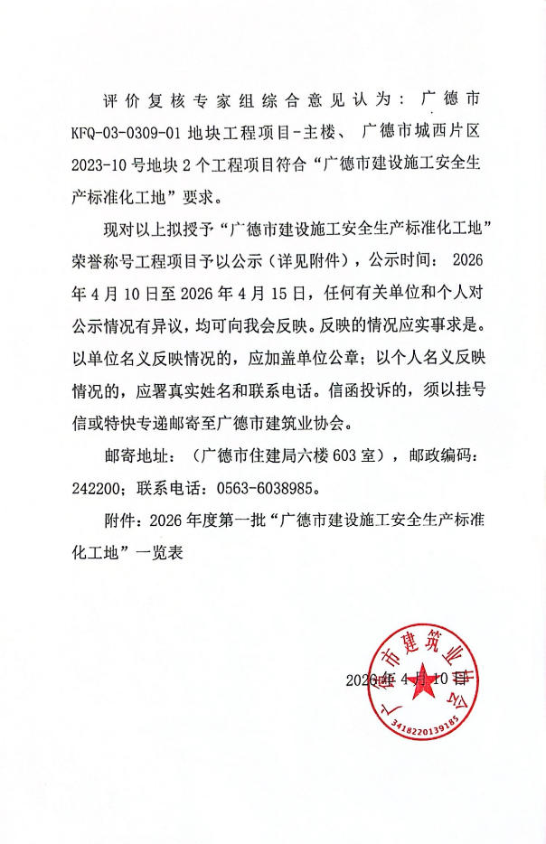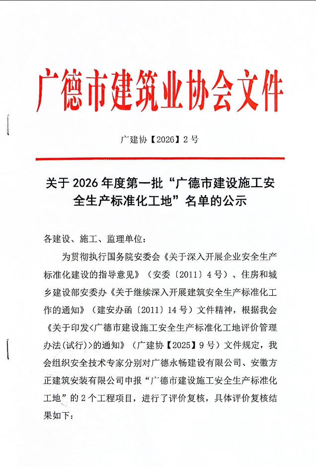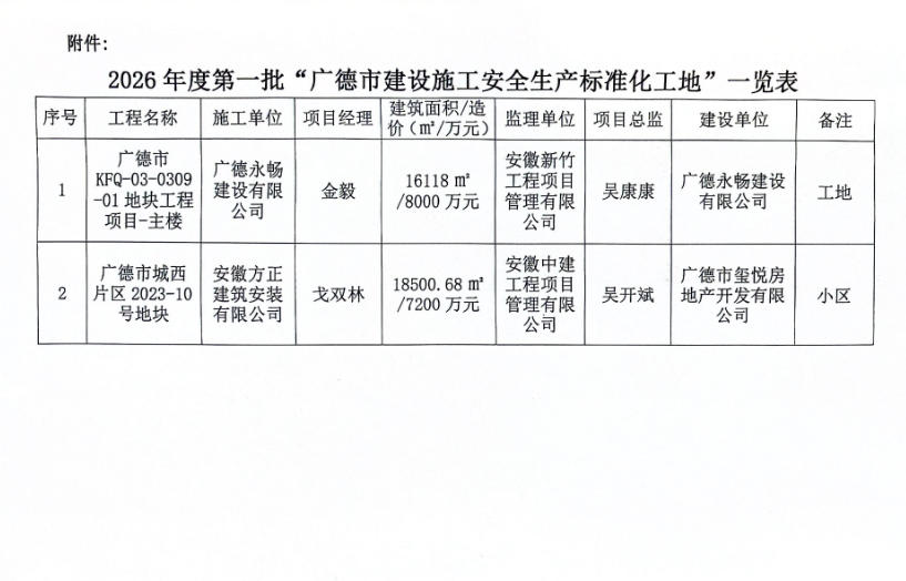 关于2026年度第一批“广德市建设施工安全生产标准化工地”名单的公示