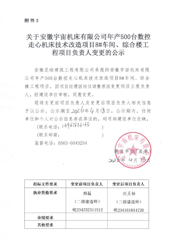关于安徽宇宙机床有限公司年产500台数控走心机床技术改造项目8#车间、综合楼工程项目负责人变更的公示