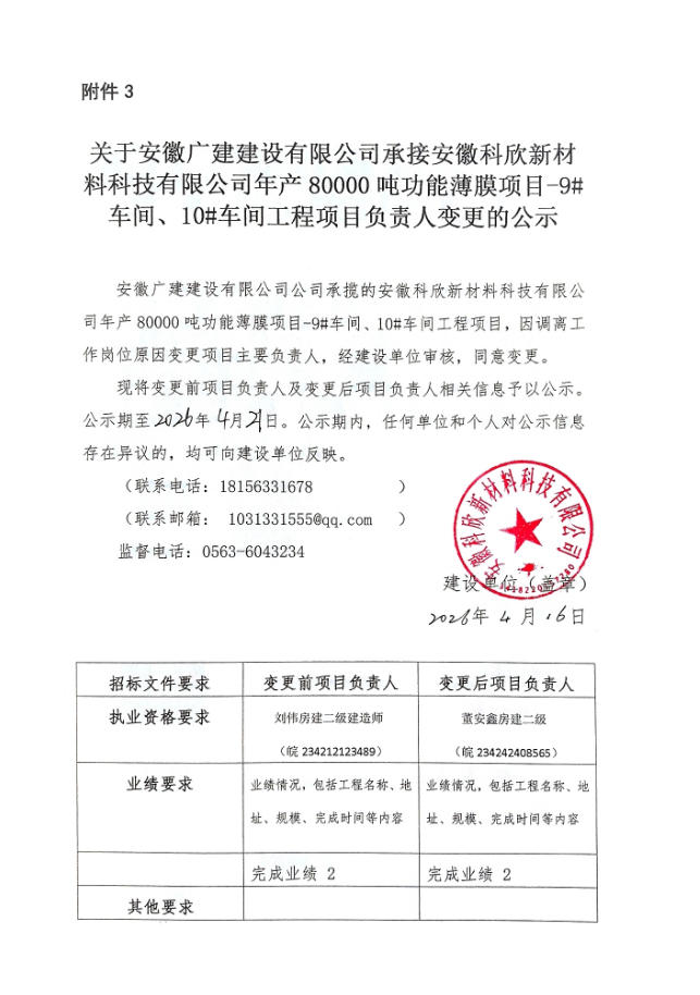 关于安徽广建建设有限公司承接安徽科欣新材料科技有限公司年产80000吨功能薄膜项目负责人变更的公示